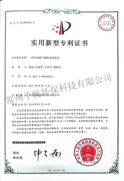 實(shí)用新型專(zhuān)利證書(shū) 一種用于處理含塵有機(jī)廢氣的一體化裝置