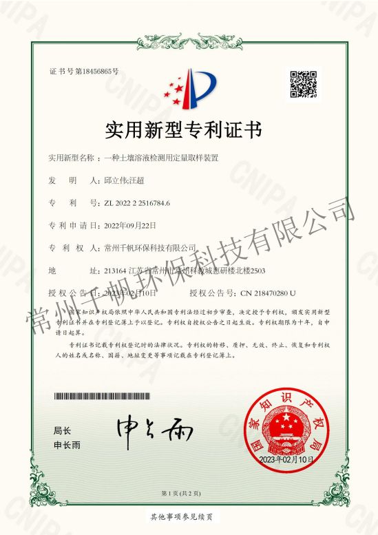 實(shí)用新型專(zhuān)利證書(shū) 一種土壤溶液檢測(cè)用定量取樣裝置